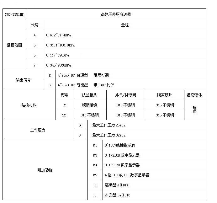 YMC-3351HP高静压差压变送器可在工作压力32MPa以下测量差压,由于具有32MPa的耐工作压力和过载保护,确保了变送器能在高静压系统中得到可靠的应用。