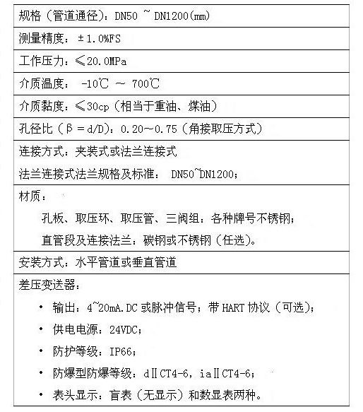 法兰连接式:流量计一对法兰与工艺管道法兰对接。四、主要技术参数: